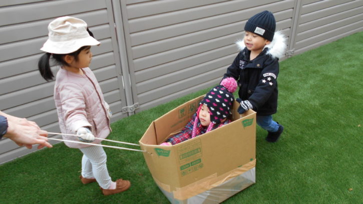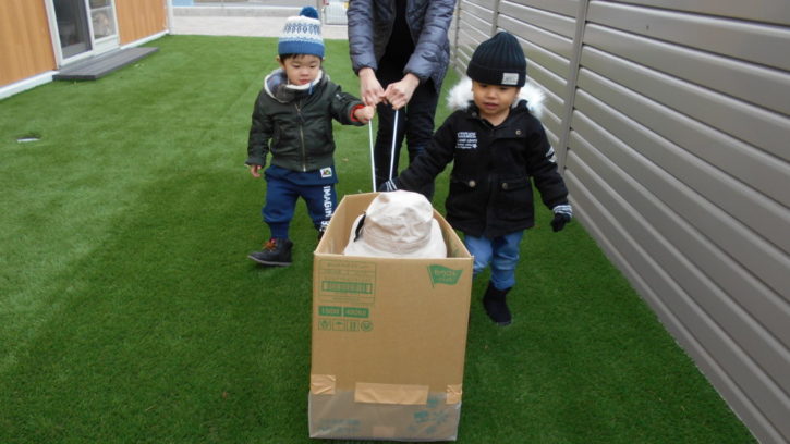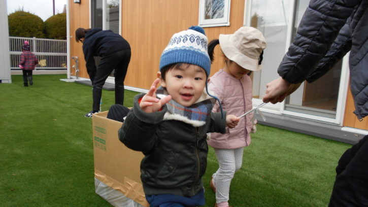 箱で作ったそりを、順番で引いたり、押したり、乗ったり🎶して遊びました(^^)/