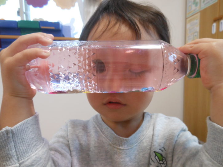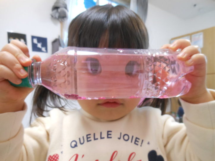 ペットボトルにお水を入れてのぞいたら・・・おめめ👀がとても大きくなりました💞