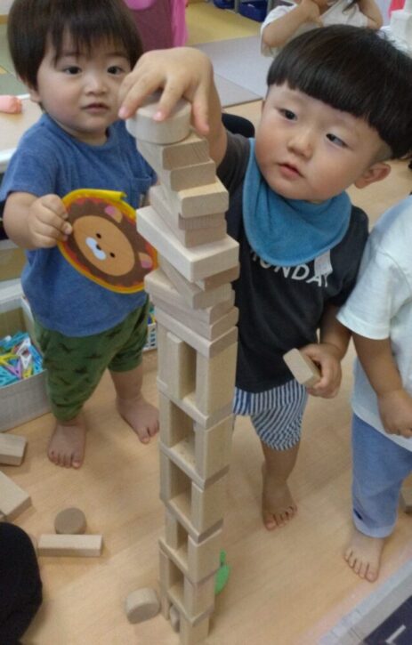こちらでは、お友だちと協力して、『積木』に挑戦しています❣❣