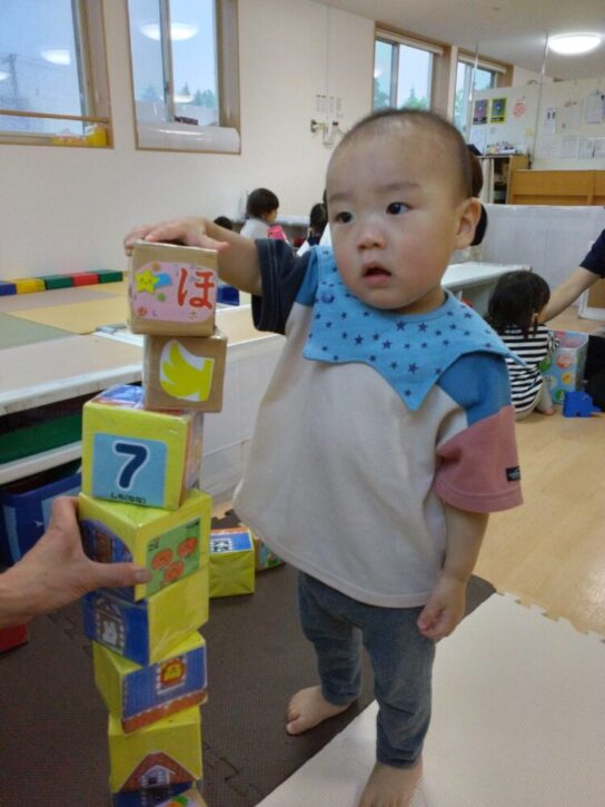 こちらでは、積み木ブロックを、こんなに高く積めるようになりました!(^^)!