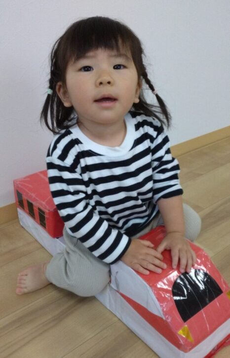 手作りの電車に乗って、とても楽しそうです🚊🚋