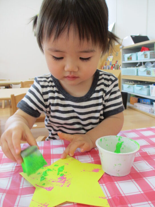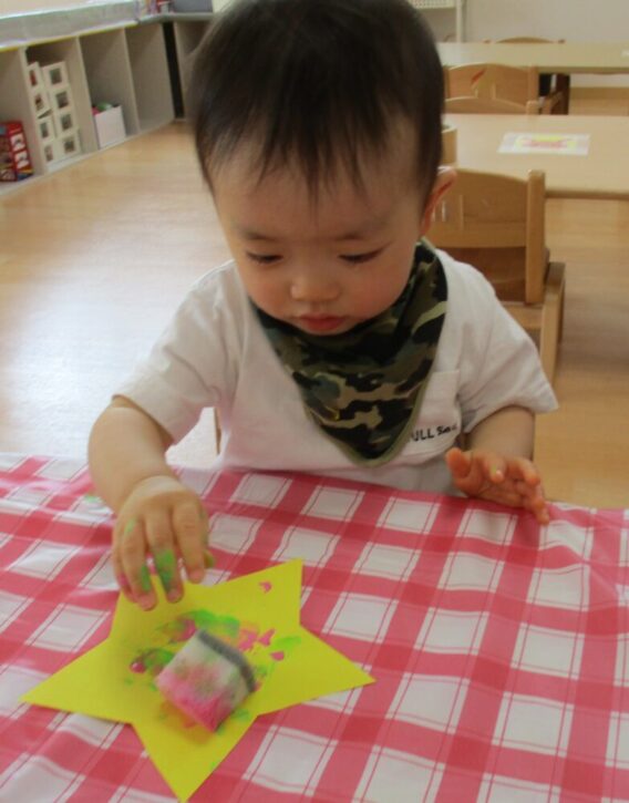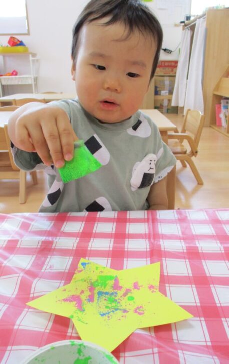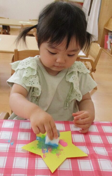 つまむことが上手になってきた たんぽぽ組さんは、製作でスポンジを使ってスタンプにも挑戦しました🔅