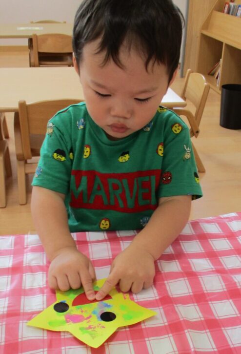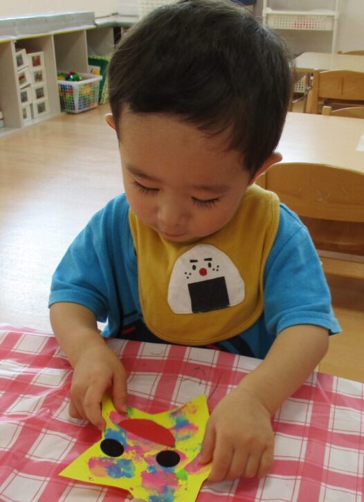 手に絵の具がつくのも慣れてきて、「くすぐったいよ~」と楽しみながら手形がとれました。