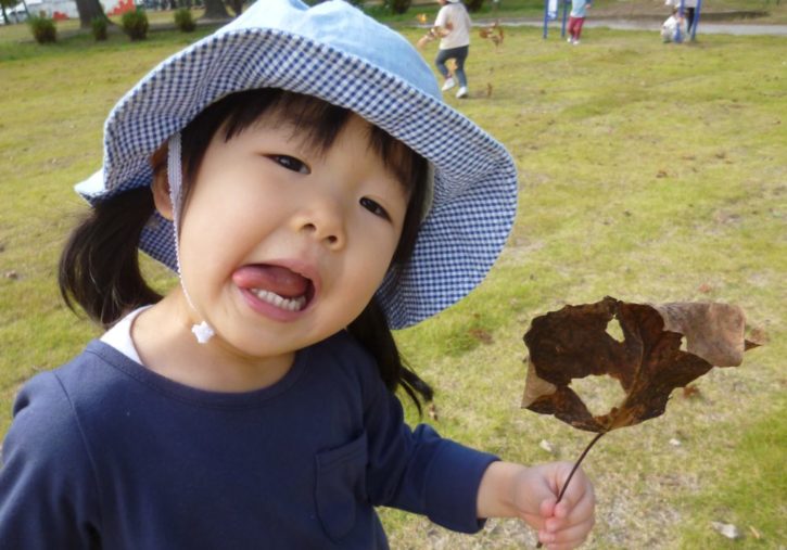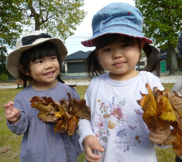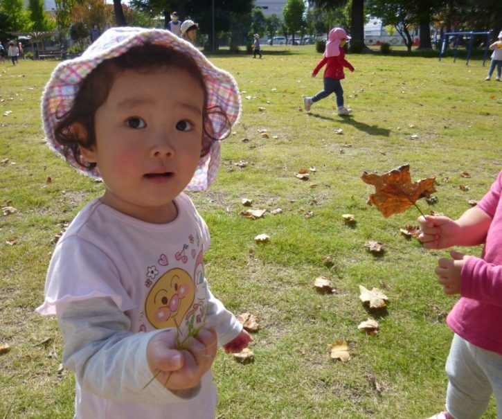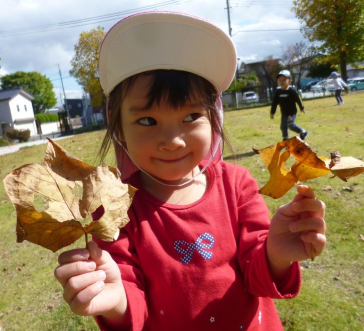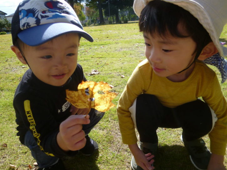 本格的な秋の訪れに、外遊びを楽しんでいる子どもたち。落ち葉を踏みしめたり拾ったりと、秋の自然に親しんでいます。
