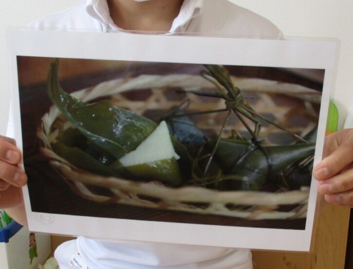 「ちまき」は、お餅になるお米と、みんながいつも食べているお米を混ぜて笹の葉で包んで柔らかくしたものです。